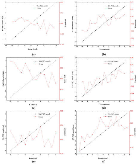 The SA–PSO results and the error for the experiments. (a) X rotation results and errors. (b) X translation results and errors. (c) Y rotation results and errors. (d) Y translation results and errors. (e) Z rotation results and errors. (f) Z translation results and errors.