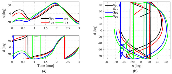 The total tracking period is set to be 3 h, with a measurement interval of 10 s. The nominal angular measurements of the four targets are shown in Figure 4. Figure 4a illustrates the time history of the declination and the right ascension , and Figure 4b illustrates the projection of these two angular measurements. It can be seen that the orbits cross at around min and min.