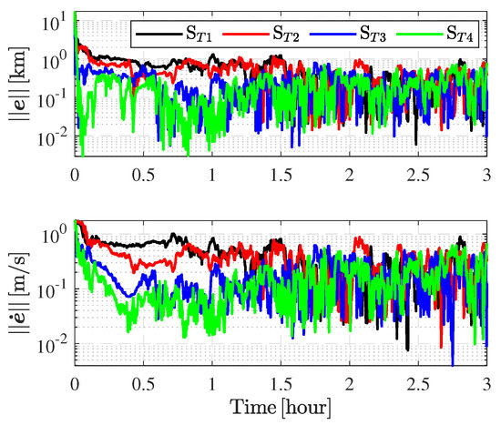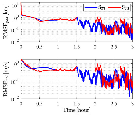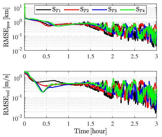 The RMSEs of the 300 Monte Carlo runs are shown in Figure 6, and the mean RMSE is listed in Table 4. As shown in Table 4, the position and velocity RMSEs are smaller than 0.71 km and 0.46 m/s. All the four targets are well tracked. The second target () has the best estimation accuracy, with the position and velocity RMSEs being 0.6108 km and 0.4197 m/s. The third target () has the poorest estimation precision, with the position and velocity RMSEs being 0.7004 km and 0.4594 m/s. The differences in estimation accuracy are related to the observation configuration, which is not discussed in this paper. The readers with the interest on this issue can refer to [4,44,45,46].