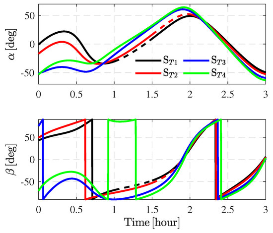 The details on how these differential equations are obtained are well provided by Park and Scheeres [34]. For brevity, they are not given in this paper, and any reader with particular interest on this issue can refer to [34]. In this paper, for the dynamics mentioned in Equations (1) and (2), the partials in Equations (12) and (13) are analytically computed using the MATLAB’s symbolic toolbox (MATLAB version R2019a, The MathWorks, Inc., Natick, MA, USA).