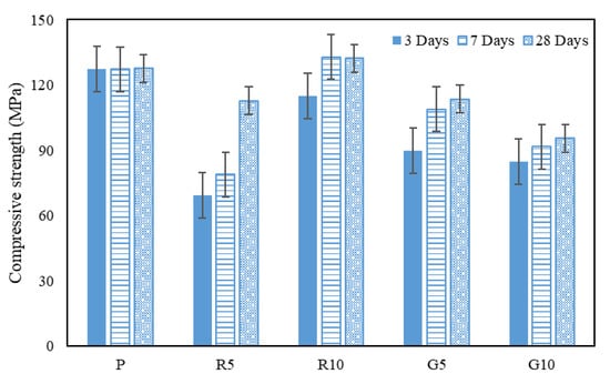Figure 2 displays the compressive strengths of the C-UHSCC samples mixed with the inorganic pigments. Compressive strengths were measured at 3, 7, and 28 days, and the average strength values of the three specimens of different ages were used. Error bars exhibited a 95% confidence level. The compressive strength test results revealed that the specimen strength differed according to the inorganic pigment color. The initial hydration reactions of all the specimens were maximized through a 72 h steam-curing process, which accelerated the initial strength-development rate [29]. For specimen P, which had no pigment, the strength at 28 days of age showed negligible change from that at an early age measured after the completion of steam curing. This result indicates that the maximum strength was developed for specimen P because of the completion of all hydration reactions [30]. For the red specimens, the strength development was higher than that of specimen P as the pigment content increased with age; this was because the filling effect of the Fe2O3 component in the red pigment contributed to the strength development [20]. Compared with the red specimens, the green specimens exhibited lower strength; however, their strength gradually increased with age. Although the water used for mixing was adsorbed on the pigments during the initial mixing process, the hydration reaction progressed under steam curing. As adequate amounts of moisture and heat were continuously supplied under atmospheric pressure to the specimens, further strength development was achieved [12,31,32,33,34].