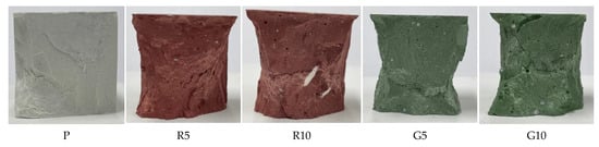 As presented in Table 3, the color difference of specimen P tended to increase with age, whereas the pigment content in each sample remained constant. However, for other samples, the color difference increased or decreased at 7 and 28 days of age. The color change with age was the smallest in the red-pigmented samples, followed by specimen G10. Specimen G5 exhibited the largest difference, and the color difference between 7 and 28 days was 4.5.