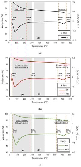 TGA of samples at three days. (a) TGA results of specimen P at the age of three days, (b) TGA results of specimens R5 and R10 at the age of three days, and (c) TGA results of specimens G5 and G10 at the age of three days.