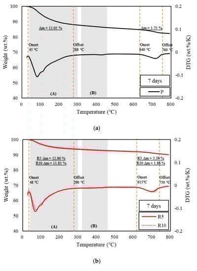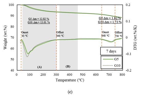 TGA of samples at seven days. (a) TGA results of specimen P at the age of seven days, (b) TGA results of specimens R5 and R10 at the age of seven days, and (c) TGA results of specimens GR5 and G10 at the age of seven days.