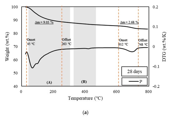 The pozzolanic reaction and strength development depend on the amount of calcium hydroxide generated by the hydration reaction of cement [38]. TGA is typically used to measure the calcium hydroxide content in cement. TGA was conducted using the DTG curves of HSCCs shown in Figure 3, Figure 4 and Figure 5. The amount of calcium hydroxide (Δm) generated in each specimen was quantified, and the values are plotted in Figure 3, Figure 4 and Figure 5. The analysis of hydration dynamics using TGA was performed by employing two methods (DTG/TGA), and a stepwise method was used here. The weight loss of C–S–H, ettringite, and monocarbonate occurred in the range below 230 °C [39]. Calcium hydroxide decomposed in the ranges 380 °C to 480 °C [40] and 400 °C to 560 °C, and the difference in mass was used to determine the amount of calcium hydroxide [41,42]. The weight loss in TG was caused by calcium-hydroxide dehydration, and this value was used to quantify the amount of calcium hydroxide. A major quantity of calcium hydroxide was generated rapidly in the C-UHSCC specimens during the initial steam-curing process, and this quantity increased or decreased as the curing period increased, which indicated that internal hydration was in progress. When the pigments were added, the calcium hydrate content increased relative to that of specimen P as the age increased. This phenomenon indicated that the moisture absorbed by the pigments was released, or the hydration was delayed owing to the moisture supplied during the steam-curing process.