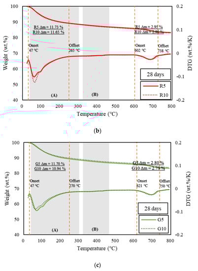 TGA of samples at 28 days. (a) TGA results of specimen P at the age of 28 days, (b) TGA results of specimens R5 and R10 at the age of 28 days, and (c) TGA results of specimens G5 and G10 at the age of 28 days.