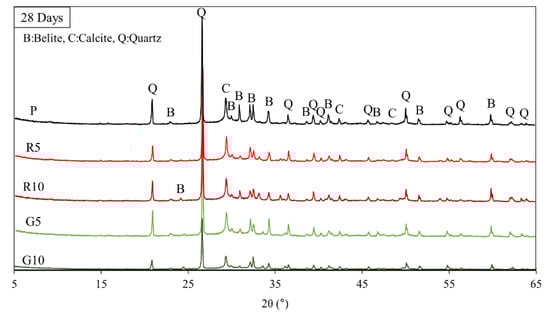 XRD patterns of samples showing the specimen powders produced at 28 days of age, where peaks B, C, and Q represent belite, calcite, and quartz, respectively.