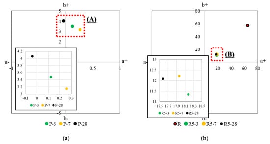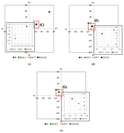 Figure 8 shows the results of analyzing the chromaticity of HSCCs by age, and Table 3 presents the results of analyzing the color of each sample by age. The x-axis of the subplots of Figure 8 represents the red–green axis, and the y-axis represents the yellow–blue axis, using a* and b* as color coordinate indices. The a+ direction is red, and the a− direction is green. Furthermore, the b+ direction is yellow, and the b− direction is blue [51]. Each pigment was located in a certain section (A to G) regardless of age. However, slight differences were observed depending on the age because of the humid environment during the standard curing. Furthermore, in the thermogravimetry results, when the pigment content was 10% for yellow and green in the range of 45–210 °C, which was the hydrate combustion and dehydration section, the proportion of Δm was lower than that at a pigment content of 5%. This result indicated that a slight difference occurred during the reaction between the pigment and the moisture content. In contrast, for the red pigment, the proportion of Δm was similar regardless of its content, confirming a tendency similar to that observed in the chromaticity analysis.