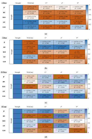 The 28-day-old specimens showed higher correlations between the strength and analysis factors than the unaged specimens. Except for the a* of specimen P, TGA (Δm) of R10, and a* of G10, R2 was calculated to be 0.5 or higher. This is because trends of continuous increases and decreases in the intensity expression, TGA (Δm), and color factors appear as the age increases.