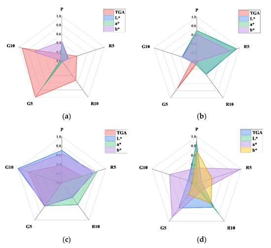 The linear relationships between the experimental characteristics of the prepared HSCCs were identified. The correlation analysis matrices shown in Figure 9 and Figure 10 illustrate the relative experimental trends of HSCCs based on the pigment type and mixing rate and exhibit unique R2 values. This result could serve as a reference for determining the weight factors during the development of HSCCs in the future.