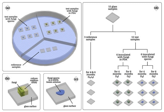 Experimental design (a) Petri dish with glass samples (includes reference samples, samples inoculated with fungal spores (b) and samples inoculated with PDA (c). Glass biodeterioration experiment design and sample number (d).