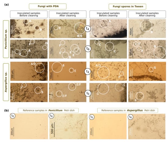 Optical microscopy results from (a) the inoculation of SPB-87 with Penicillium chrysogenum and Aspergillus niger, and of (b) the reference samples placed inside the same conditions of the inoculation environment. Legend: (A) clear biological colonisation/mycelium, (B) chromatic alterations (spots, stains, iridescence), (C) mycelium growth up to the edge, (D) denser mycelium near the PDA, (E) Etching/biopitting produced by hyphae, (F) crystal formation, (G) growth of mycelium from the spores.