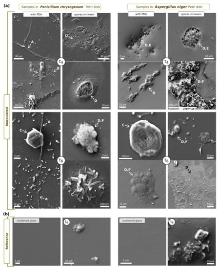SEM images of samples inoculated with (a) Penicillium chrysogenum and Aspergillus niger, in PDA or as spores in Tween solution, at t4 and t6 periods of incubation; and (b) of the reference samples incubated in the same Petri dishes after 6 months (t6). Legend: (A) hyphae fingerprints; (B) spores fingerprints; (C) crystal formation; (D) depletion/deposition of elements; (E) biopitting; (F) exometabolites.