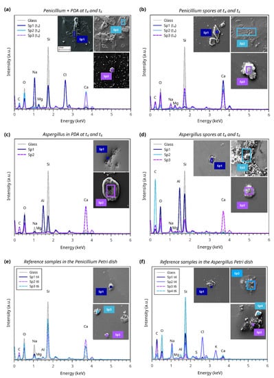 SEM-EDS spectra of crystals and surface alterations of the SPB-87 glass samples (analysis spots marked in the SEM images presented), inoculated with (a) Penicillium chrysogenum (PS1) in PDA or (b) PS1 spores in Tween; (c) Aspergillus niger (AS1) in PDA or (d) spores in Tween; (e) reference samples in the PS1 and (f) AS1 environments at t4 and t4.