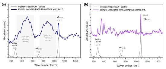 Similar observations can be made for the inoculation with PS1 spores, where at t4 it is possible to observe the formation of likely calcite/aragonite crystals (see Figure 4b Sp1 and the corresponding column in Table 2). Both at t4 and t6, fungal fingerprints can be found associated with Ca and O enrichment (Sp2 and Sp3 in Figure 4b and Table 2). At t6, the marks of inoculation with PS1 spores are clearly identifiable by the presence of crystalline CaCO3 by Raman spectroscopy (Appendix A, Figure A4a): (i) the ’internal vibration modes’, originating from vibrations between the C and O of carbonate (CO3, are present as a strong peak around 1087 cm (symmetric stretching of C−O bonds), and the in-plane bend () in the 700–720 cm region of C−O bonds (slightly overlapped by glass matrix vibration modes) [], and also (ii) the crystalline ’lattice’ or ’external modes’ in the <400 cm region that result from vibrations between molecules in the lattice, being mineral-specific, and in this case appearing around 278 cm [].