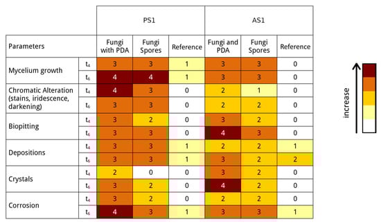 Summary of the damages observed in all samples after 4 and 6 months incubation–comparative analysis. Average damage is classified into a semi-quantitative scale from 0 to 4 (from non-existent to very pronounced, considering parameters such as density, quantity, and dimensions). A chromatic scale is used for better visualisation of the data.