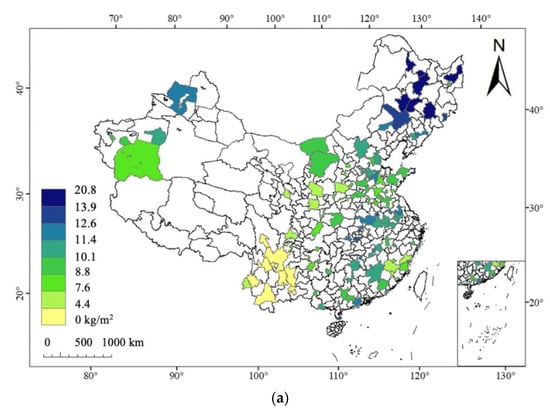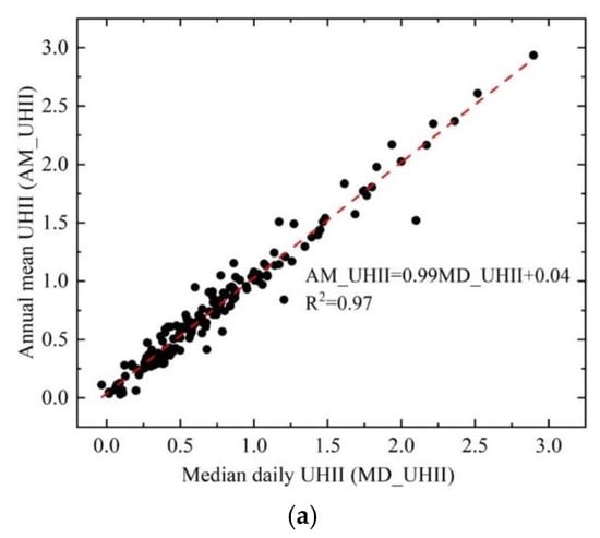 The annual mean UHII ranges from 0.03 to 3.1 °C; 52.3% of cities have an annual mean UHII between 0.5 and 1 °C. The relationship between annual mean UHII and daily maximum UHII or median daily UHII in different cities was analyzed and the results are shown in Figure 3. It is found that the annual mean UHII has positive correlations with the maximum of daily mean UHII (Figure 3a) and median of daily mean UHII (Figure 3b). With R2 = 0.97, the median of daily mean UHII can represent well the annual mean UHII. The maximum daily mean UHII has a weaker correlation with annual mean UHII (R2 = 0.26) as indicated by more scattered data points in Figure 3a compared to Figure 3b. It suggests that large-scale background weather, such as extreme heat waves [52], can affect the daily mean UHII occasionally, leading to extreme values of daily UHII. The deviation of the maximum daily mean UHII from the annual mean UHII is large, which suggests that we should consider extreme weather conditions in urban planning and policymaking to avoid dramatic damage.