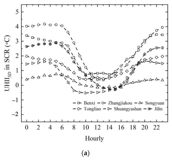 The characteristics of temporal variation of UHII are shown in Figure 4. Figure 4a presents the typical variation of synthetic daily UHII profiles based on the whole year data for SCR cities (Equation (2)), i.e., . A “U” shape forms for most cities. begins to decrease around 6 am after sunrise because the rural air temperature increases rapidly because of its relatively low thermal capacity. During 10:00–14:00, the UHIISD reaches the lowest values and begins to increase after around 16:00 when the solar radiation decreases dramatically [53]. As for the seasonal mean UHII (Figure 4b), the values are lowest in summer and highest in winter. The relatively low value of solar radiation intensity and high anthropogenic heat emissions due to heating demand in buildings contribute to the high UHII in winter [52]. The magnitude of UHII during spring has a value similar to that during autumn. It should be mentioned that the temporal variation of UHII in other cities presents a similar trend as in typical SCR cities shown in Figure 4. For simplicity, the data are not shown here.