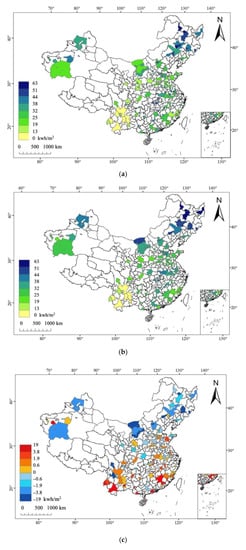 In addition to the heating/cooling load, the coefficient of performance (COP) of the energy conversion system also affects the final electricity or coal consumption. In the SCR and CR regions, a central heating system was applied and the central heating demand was mostly provided by heating boilers with coal consumption [49]. In the other building climate zones (HSCWR, HSWWR, and MR), heating and cooling are mainly provided by split air conditioners in residential buildings. The split air conditioner usually has a larger COP during cooling compared to heating, in which case, the same value of heating or cooling load results in different electricity consumption. Therefore, we calculated three values to understand how the UHII affects energy consumption, as follows: (1) the load (cooling load and heating load), (2) the electricity consumption (converted from the load), and (3) the coal consumption (converted from electricity consumption and heating load in SCR and CR). In the calculation of electricity consumption, a split air conditioner was assumed to be used in SCR and CR as those in the other three-building climate zones (HSCWR, HSWWR, and MR) for the sake of the comparison. For the coal consumption calculation, central heating with coal combustion boilers was applied in SCR and CR during the heating season, while the split air conditioner was adopted during the cooling season in all five building climate zones and during the heating season in HSCWR, HSWWR, and MR.