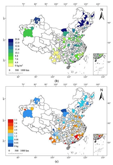 Figure 5 and Figure 6 present the simulated value of electricity consumption (Equation (4)) and coal consumption (Equation (5)), respectively, for a typical residential building in different cities across five building climate zones in China. Under the influences of the UHI, the consumption of electricity and coal decreased by 96.7% (29 out of 30) in SCR cities. The electricity consumption can be reduced by 0.5–18.8 kWh/m2, and the relative change ranges from 0.9% to 41.3%. The corresponding coal consumption can be reduced by 0.2–6.2 kg/m2. The energy consumption increases only in Naiman city, due to the different characteristics of its UHII. The winter UHII in Naiman city is 0.5 °C and the summer UHII is 1 °C, inducing more energy consumption in summer than energy saving in winter. The winter UHII helps to save electricity consumption by 1.28 kWh/m2 and coal consumption by 0.42 kg/m2. However, the summer UHII induces more electricity and coal consumption, 1.4 kWh/m2 and 0.43 kg/m2, respectively. Therefore, the overall effect of the UHI in Naiman city is to induce more energy consumption, 0.01 kg/m2 for coal consumption and 0.12 kWh/m2 for electricity consumption. In CR, 45 out of 74 cities (60.8%) have lower energy consumption in the presence of the UHI. The electricity consumption and coal consumption saving due to the UHI are in the range 0.03–4.5 kWh/m2 (saving 0.11–14.4%) and 0.04–1.5 kg/m2 (saving 0.4–14.7%), respectively. In the other 29 cities, the energy consumption was increased by the UHI. The percentage of increase for electricity and coal consumption are around 0.1–20.1% and 0.04–21.7%, respectively.