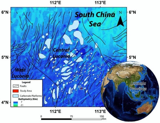 - Jamaludin, S.F.; Pubellier, M.; Menier, D. Relationship between syn-depositional faulting and carbonate growth in Central Luconia Province, Malaysia. Bull. Geol. Soc. Malays. 2014, 60, 77–83. [Google Scholar] [CrossRef]