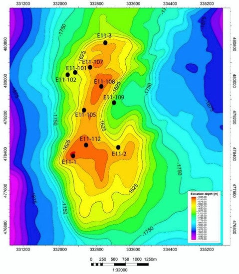 The E11 field has already been the subject of several geological and seismic studies, including [3,4,9,10,15]. The E11 field is located in the Central Luconia province in the South China Sea, 100–300 km from the present coastline, offshore Sarawak, Borneo, in water depths of 60–140 m. The E11 structure is a pinnacle buildup of 7 by 9 Km in size, laterally interfingering with Cycle V clastics in its upper part. The depth of the top buildup is approximately 1500 m. The thickness of the buildup is 650 m, with an overall areal extent of 7.3 × 10.3 Km (Figure 2). The age of the carbonate buildup is interpreted as the Middle to Late Miocene age based on biostratigraphic studies [3] and 16 Ma to 12.3 Ma based on Sr dating [11].