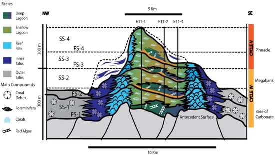 Geomorphologically, the field consists of a lower megaplatform complex and an upper pinnacle stage (Figure 3).