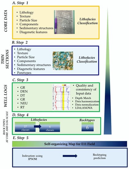 The workflow used for this study. (A) Step 1: Core data description, (B) Step 2: Thin section description, (C) Step 3: Well log interpretation, (D) Step 4: Lithofacies and Rocktypes interpretation, and (E) Step 5: IPSOM probabilized self-organizing maps for facies prediction SOM.