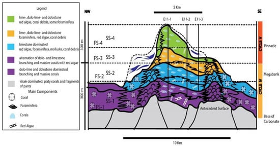 In this work, rock types derived from core data are discussed in detail from one of these hydrocarbon-bearing buildups, the E11 field. The core data from two wells, wireline logs of 10 wells, and top markers are correlated in terms of flooding intervals, defining three main carbonate reservoir zones, divided by four tight layers corresponding to major flooding events.