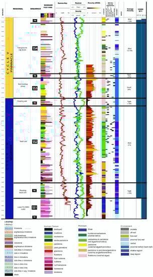 The distribution of reservoir properties within these carbonate buildups (pore types, porosity, grain density, permeability) is probably an expression of the global or regional environmental factors, leading to exposure and flooding-related reservoir quality changes [11]. Thus, this highlights the need for a solid understanding of the original rock fabrics/facies, associated depositional environments, diagenetic modifications, and their petrophysical expression to consolidate lithofacies, petrophysical groups, and rock types that can be distributed in a geologically realistic manner during reservoir modeling. This distinction controls both the static and dynamic characteristics of a reservoir while linking geological attributes to spatial trends [12].