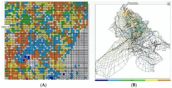 We performed clustering of the inputs to obtain a downsampled but representative set of “nodes”. The SOM structure comprises a single-layer linear 2D grid of neurons, instead of a series of layers. The SOM was used to cluster the well data into six rock type classes, as shown in Figure 8. The clustering was carried out using a two-level approach, where the data set was first clustered using the SOM, and then the SOM was finally clustered. These results are only valid if the clusters using the SOM are similar to those of the original data.