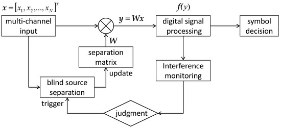 First, the multi-channel input signal is left-multiplied by a separation matrix to separate the signal from the interference, and the signal component enters the digital signal-processing module, which includes conventional receiver algorithms, such as channel estimation and channel equalization. Then, the processed signal is divided into two channels. The channel other than the output channel enters the interference-monitoring module. Usually, the interference-monitoring module runs periodically. Once the input interference exceeds the configured threshold, a single operation of the blind source-separation module will be triggered.