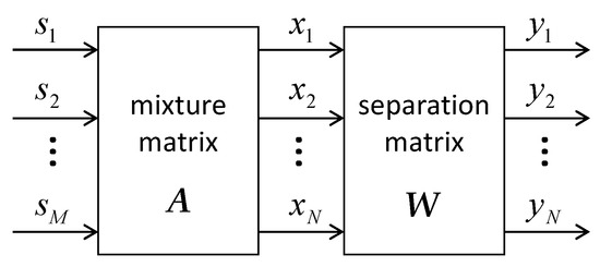 Blind source separation is a technique that recovers or extracts independent source signals from mixed signals without knowing the distribution or the mixing model of the source signals [19,20]. The schematic diagram is shown in Figure 2.