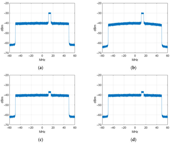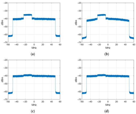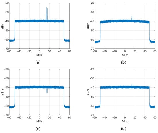 Comparing the interference suppression capability of different methods to in-band spurs by output spectra: (a) Original signal without any suppression, (b) Signal after equalization suppression, (c) Signal after fine notch filtering, and (d) Signal after the fusion anti-interference scheme.