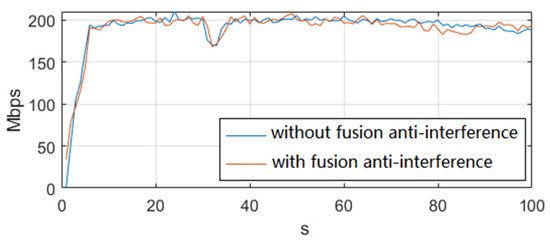 In order to ensure the enhanced Mobile Broadband (eMBB) characteristics of the 5G communication systems and allow access to underground large-bandwidth data services, the upload rate of the base station should not be lower than 180 Mbps. Five upload-rate tests were carried out, and the average value was taken, as shown in Figure 9. It can be seen that the uplink rate between the terminal and the base station was stable within the range of 180 Mbps to 200 Mbps, and the uplink rate was not affected by the fusion anti-interference scheme.