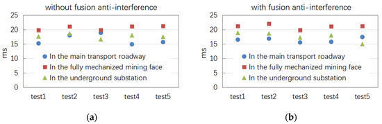The communication delay tests were carried out in the main transport roadway, the fully mechanized mining face, and the underground substation. In both cases without fusion anti-interference and with fusion anti-interference, five tests were performed, as shown in Figure 10. We can see that the communication delay was largely unaffected by the fusion anti-interference scheme.