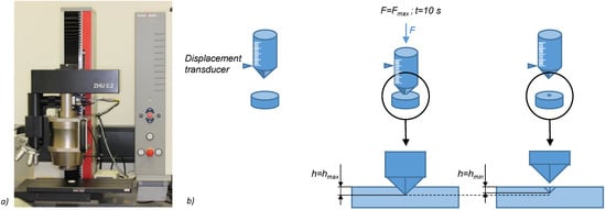 (a) ZwickiLine Z2.5 and (b) schematic test procedure with maximum indentation depth (hmax) at application of maximum force (Fmax) and residual indentation depth (hmin) after stress relaxation.