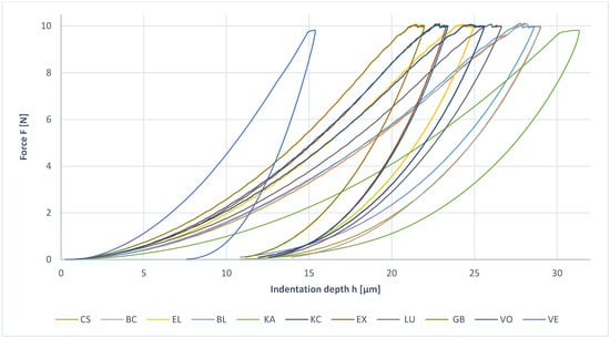 Figure 4 shows the force–indentation depth curves, which highlight individual parameters investigated in this study. In comparison to research on the Martens hardness of CAD/CAM resin-based materials, the published HM values for the PICN material (VE) are distinctly higher (1524–1555 N/mm2) compared to the results of this investigation (1143 N/mm2) [24,25]. Differences here were due to the transverse contraction number required for the calculations. With respect to the resin-composite materials with a filler content of more than 70%, the HM values found in the literature (667–1089 N/mm2) are in line or above the results of this study (588–771 N/mm2) [24,25,26,27]. The HM values reported in the literature for composites with a filler content below 70% are distinctly below (BC*: 151 N/mm2) [24] or in line (477–573 N/mm2) [25,27] with the values obtained in this investigation (411–603 N/mm2). The EIT values found in the literature (2.5–30 kN/mm2) are lower or in line with the results of this study (9–25 kN/mm2) [24]. The CIT values obtained in this study (3.2–5.1%) were slightly higher compared to those of the literature (2.6–3.4%) [26,27].