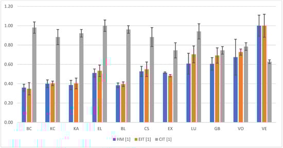 The mean Martens hardness (HM) ranged from 410.8 ± 55.8 N/mm2 (KA) to 1143.4 ± 124.7 N/mm2 (VE). The ANOVA showed significant (p ≤ 0.001) differences between the results (Table 2). The residual indentation depth (hr) was between 13.9 ± 0.7 µm (VE) and 23.0 ± 1.4 µm (KA), with significant differences between the results (ANOVA: p ≤ 0.001). The indentation hardness (HIT) varied between 666.5 ± 88.2 N/mm2 (KA) and 1834.2 ± 198.0 N/mm2 (VE). The ANOVA confirmed significant (p ≤ 0.001) differences between the results. The indentation modulus (EIT) ranged from 8.8 ± 1.4 kN/mm2 (KA) to 25.3 ± 3.0 kN/mm2 (VE), with significant differences between the results (ANOVA: p ≤ 0.001). The mean elastic part of indentation (ηIT) varied between 40.2 ± 0.5% (VO) and 50.4 ± 4.3% (LU) (Figure 3). The ANOVA confirmed significant differences between the mean values (p ≤ 0.001). The indentation creep (CIT) ranged from 3.2 ± 0.1% (VE) to 5.1 ± 0.4% (KC). The ANOVA showed significant (p ≤ 0.001) differences between the values.