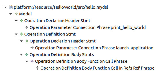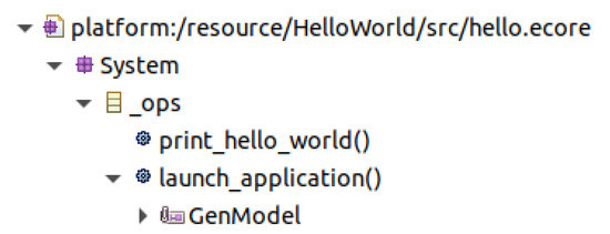 In REX, without user intervention, this text’s model or AST (see Figure 1) is compiled into an Ecore model (see Figure 2), which is then used by EMF (Eclipse Modeling Framework) [24] to generate Java code (see Listing 4. Please refer to Section 4 for more details. At this point, no semantics or implementation were provided for print_hello_world, and as such, by default, EMF throws an exception, as shown in Listing 4. There are at least two alternatives to provide an implementation for print_hello_world: (1) update the method’s implementation in the generated code file (EMF supports this, and is able to keep code that has been entered manually); (2) override the method in a subclass. Throughout this article, the second alternative will be followed. With this in mind, in Listing 5, the implementation of print_hello_world is set, alongside a possible main method.