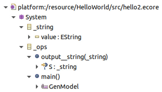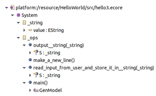 In REX, the text in Listing 6 is compiled into the Ecore model shown in Figure 3, which is then used by EMF to generate the Java code shown in Listing 11. Lastly, in Listing 12, the semantics of print a string S are set, alongside a possible main method.