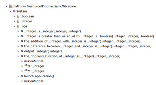 In REX, the text in Listing 13 is compiled into the Ecore model shown in Figure 4, which leads to the generation of the Java code shown in Listing 15 (only the launch_application method is shown since the rest should be straightforward by now). In Listing 16, the semantics of undefined functions are set, alongside a possible main method.