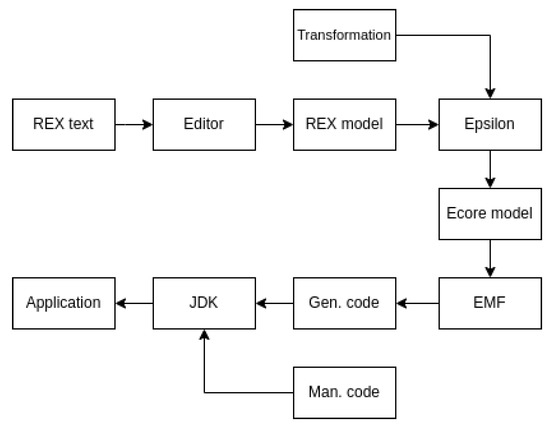In this section, the implementation of REX using the Eclipse IDE is described. Because REX has a small (but comprehensive) set of rules, and thus, a very simple grammar, its implementation is also quite straightforward. Using the tools provided by the Eclipse IDE, only two REX-specific translation units (or source files) are needed, namely, one grammar (44 rules, 113 lines of code, empty lines not included, approx. 2.5 lines of code per rule) (see https://github.com/b4795/REX/blob/main/src/org.xtext.example.mydsl/src/org/xtext/example/mydsl/MyDsl.xtext, accessed on 24 June 2022), and one model transformation (515 lines of code) (see https://github.com/b4795/REX/blob/main/src/org.xtext.example.mydsl/src/org/xtext/example/mydsl/generator/mydsl2ecore.etl, accessed on 24 June 2022). More specifically, we have used Eclipse IDE for Java and DSL Developers, version 2021-09 [25], with Xtext 2.25.0 [26], Epsilon 2.3.0 [27], EMF 2.27.0 [24], and JDK 3.18.900 (builtin).