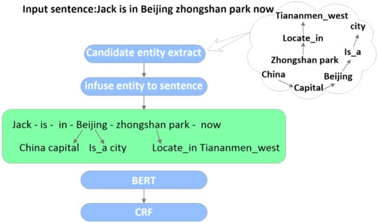 Formally, given a knowledge graph and a Chinese sentence with n characters = {}, where denotes the i-th character in the sentence and n is the length of this sentence. KG, denoted as , is a collection of triples = (), where and are names of entities. Each token is included in the vocabulary, and is the relation between and . All the triples are included in KG.