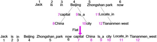 Mask-Self-Attention: The risk involved in using knowledge is that the original sentence can suffer from changes in meaning. To avoid affecting the meaning of the original sentences, some measures need to be taken. First, a sentence tree is constructed by knowledge, and each word in the sentence tree is encoded by absolute position. Then, the tokens in the sentence tree are flattened into a sequence of the token by means of their absolute-position index. In other words, the original sentence is followed by tokens in the branch. As shown in Figure 3, the sentence tree is rearranged as “Jack is in Beijing Zhongshan park now capital China is_a city locate_in Tian’an’men west”. The advantage of this is that the original semantic information of the sentence is preserved, but the sentence is still unreadable. For example, there is no connection between [] and [].