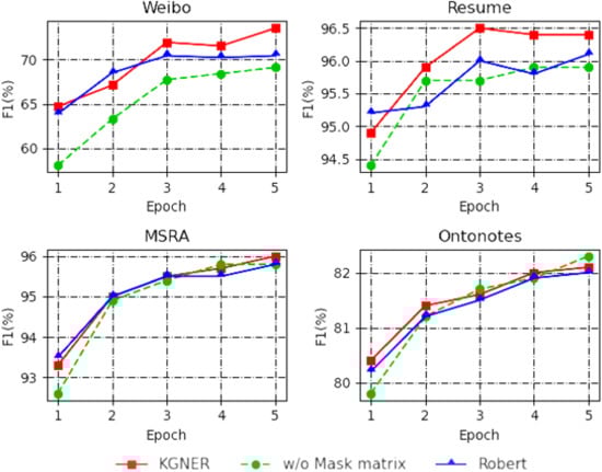 To study the role of each part of KGNER, we performed ablation experiments on the four datasets and displayed the results in Figure 5. The results demonstrate that the model’s performance is declined if the mask matrix is dropped. For example, Weibo is severely injured by 4.4 without a mask matrix. All the tokens are visible in this situation, and some tokens can be interfered by other tokens, indicating that the mask matrix plays an irreplaceable role in the graph structure.