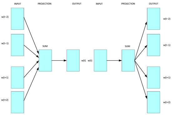 The Word2vec model was developed by Tomas Mikolov [15] et al. in 2013. It is an efficient model for training word vectors. Unlike the traditional language model, Word2vec assumes that there is a relationship between similar words in a sentence. It has two models: the skip-gram and CBOW. The model structure of Word2vec is shown in Figure 1. The skip-gram uses the current word to predict nearby words, whereas CBOW uses nearby words to predict the current word.