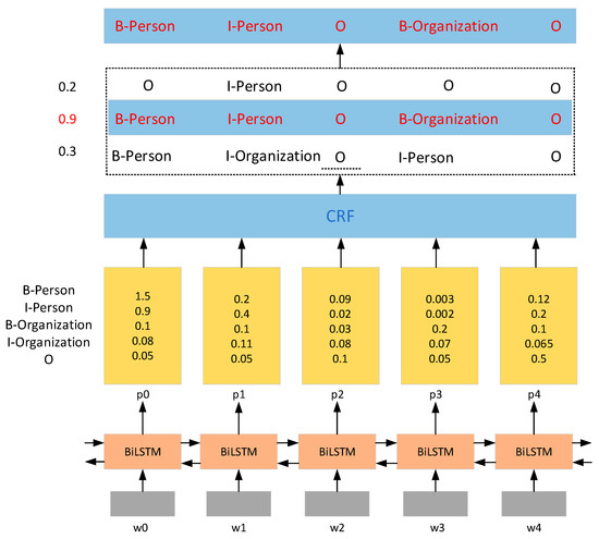 The last part is the CRF layer, which adds constraints between the labels and reduces the number of invalid predicted labels. Although the Softmax function outputs the label with the maximum probability corresponding to the word, the output labels are independent of each other. This means that the sequence is prone to unreasonable situations, resulting in a decrease in the accuracy rate, such that the time and organization entity of the “I” label may become adjacent. However, we know that according to the “BIO” labeling method, the entity tag must begin with “B”. Thus, the “I” label of the time and organization entity cannot be adjacent.