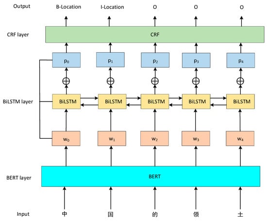 The structure of the BERT-BiLSTM-CRF model. The Chinese characters in the figure show the first to fifth characters of the territory of China expressed in Chinese.