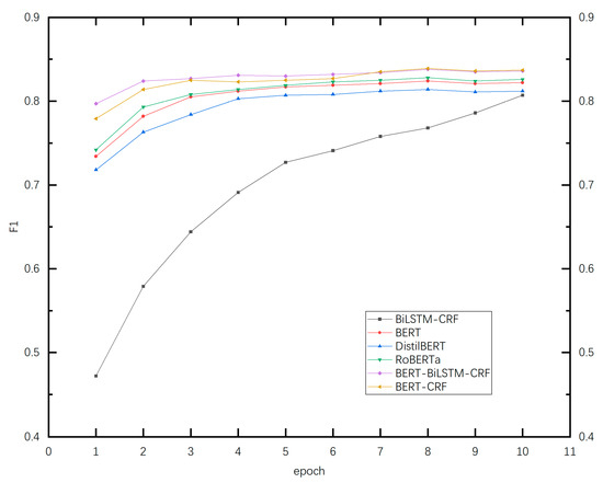Figure 6 is a line graph showing the effect of epoch times on the F1 score. As shown in the figure, the abscissa is the epoch value, and the ordinate is the F1 score. The F1 scores of the six models all increase with the increase in the number of training rounds. First, the F1 score of the BiLSTM-CRF model in the first few rounds is much lower than that of the BERT, DistilBERT, RoBERTa, BERT-CRF, and BERT-BiLSTM-CRF models. Second, as the number of training increases, the F1 scores of the six models gradually increase. The F1 score of the BiLSTM-CRF model gradually becomes close to the F1 score of the other five models that introduced BERT. At the 8th epoch, the F1 scores of the BERT-CRF model and the BERT-BiLSTM-CRF model reach the maximum. Finally, the F1 scores of the six models tend to be stable, but the F1 score of the BilSTM-CRF model lags behind those of the other five models.